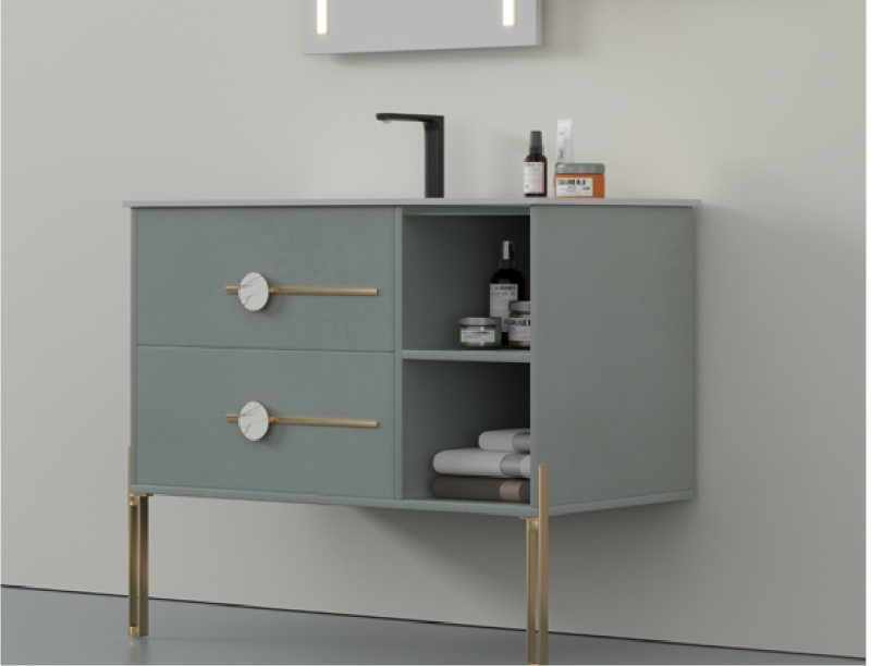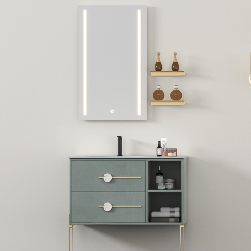 Lacquered multi-layer solid wood board,Brushed copper frame, artificial stone basin, LED mirror